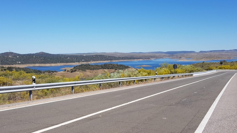 Aus dem Kartenstudium wusste ich, dass ich heute wohl an der Nähe eines Stausees vorbei fahren würde. Noch gewohnt aus Andalusien, solche blauen Flecken auf der Karte einfach zu ignorieren, war ich überrascht über die Grösse und auch die Wasserhöhe. Dem Rand rund um den See nach zu schliessen, dürfte er einigermassen voll sein.