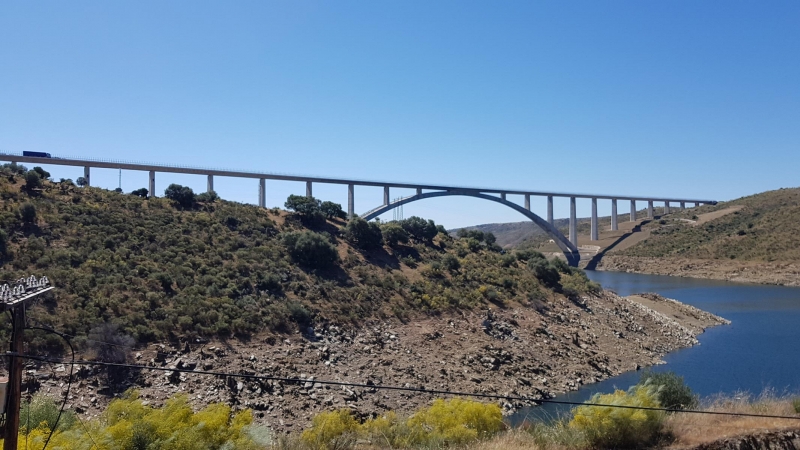 Lange fuhr ich diesem See entlang. Zwei grosse Flussarme überquerte ich dabei. Bei der Suche im Internet fand ich dann noch ein paar weitere Angaben zu diesem See. Die Staumauer ist 130 Meter hoch, die Wasseroberfläche 104 KM2 und das Fassungsvolumen 3,1 Milliarden m3. Als Vergleich dazu der Grösste Stausee in der Schweiz, Grand Dixence: Staumauer 285 Meter hoch, Wasseroberfläche 3.65 KM2 und das Fassungsvolumen etwa 400 Millionen m3. Ganz offensichtlich habe ich den wasseramen Süden Spaniens verlassen.