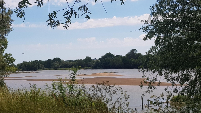 Die letzten Kilometer vor dem Hotel fuhr ich auf einem Damm entlang der Loire. Schönste Aussicht, rechts über Ackerland, Getreidefelder, Wiesen und Rebstöcke während linkerhand, auf der anderen Seite der Loire, immer wieder Ortschaften auftauchten.