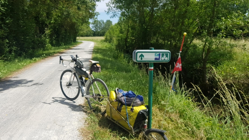 … suchte anschliessend die Markierungen der EuroVelo 6 (Atlantik-Schwarzes Meer) und leitete somit meinen letzten Teil der Heimreise von Spanien in die Schweiz zurück, ein. Das typische Kennzeichen mit dem Eurowappen und der “6” ist ganz klein im Wegweiser enthalten. Offensichtlich ist die Route “Loire à Vélo” ein Teil dieser EuroVelo 6. Die Wegweiser stimmen jedenfalls mit meinem Track überein.