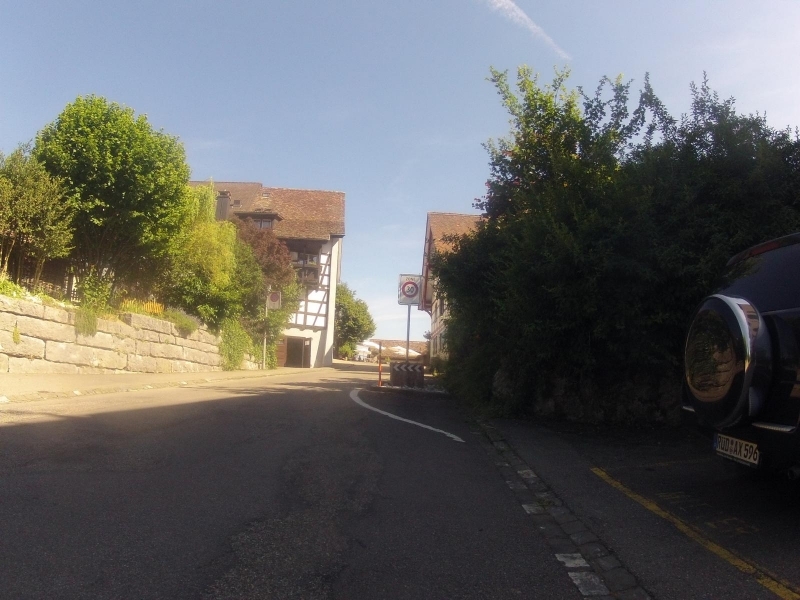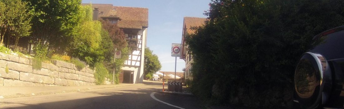 Im Städtchen Regensberg flacht die Strasse spürbar ab, führt dann noch mit ein paar wenigen Kurven bis zum höchsten Punkt, vorbei an einem Parkplatz mit schöner Aussicht auf das Städtchen und das dahinterliegende flache Gebiet. Schon geht es wieder hinunter nach Boppelsen.