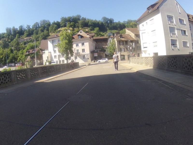 Die Aare überquere ich schon bald nach der Wegfahrt. Hinunter durch die verkehrsbefreite Altstadt geht es gleich über die Brücke, die auch im Wappen der Stadt Brugg zu erkennen ist.