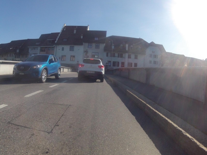 Direkt nach der Brücke gibt es einen kleinen Weg durch die Altstadt von Mellingen. Danach gibt es genügend Radwege um fast verkehrsfrei zum Birrfeld hinauf zu gelangen. Die letzten paar Kilometer kann ich dann aber trotzdem wieder auf den normalen Hauptstrassen nach Hause fahren, da die Phase des Feierabendverkehrs schon fast vorbei ist.