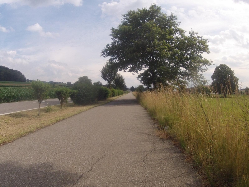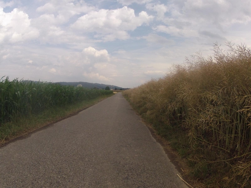 das Meiste auf Radwegen, oder wenigstens auf wenig befahrenen Strassen. Die Getreidefelder und vor allem die Maisfelder sind in den letzten Wochen in eine Höhe gewachsen, die langsam zur Sichtbehinderung wird. Einige der Getreidefelder wurden bereits geerntet.