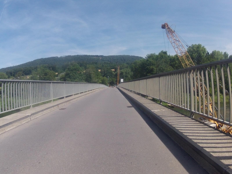 Es sind dies zwei Brücken hinter einander. Beide zu schmal, damit sich hier Autos kreuzen könnten. Das soll sich in den nächsten Jahren ändern. Die bestehenden Brücken werden wohl künftig Fussgänger und Radfahrer auf die andere Seite des Aaretales tragen. Für die Autos wird parallel dazu eine neue Brücke erstellt.