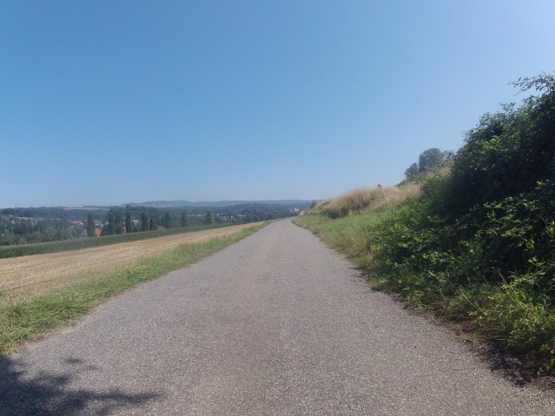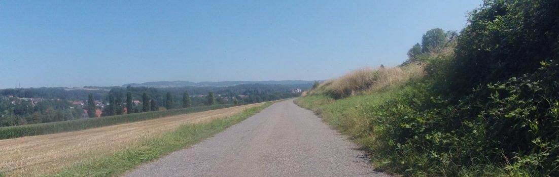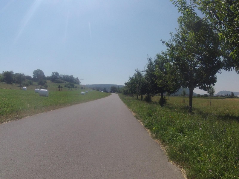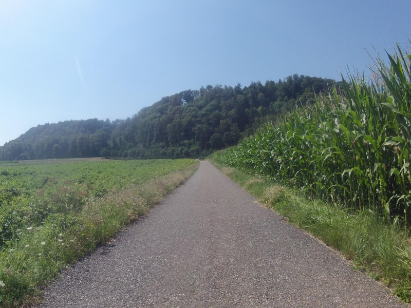 Irgendwie fehlte mir heute die Motivation, an der Wärme ganz auf den Bözberg hinauf zu fahren. Mein gesetztes KM-Ziel würde ich wohl auch erreichen, wenn ich statt dessen die Bürensteig nehmen würde. Dort hoffte ich auf Schatten während der Auffahrt. Doch zuerst ging es noch entlang des Villigerfeldes. Weitgehend offene Landschaft an der Sonne.