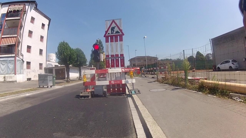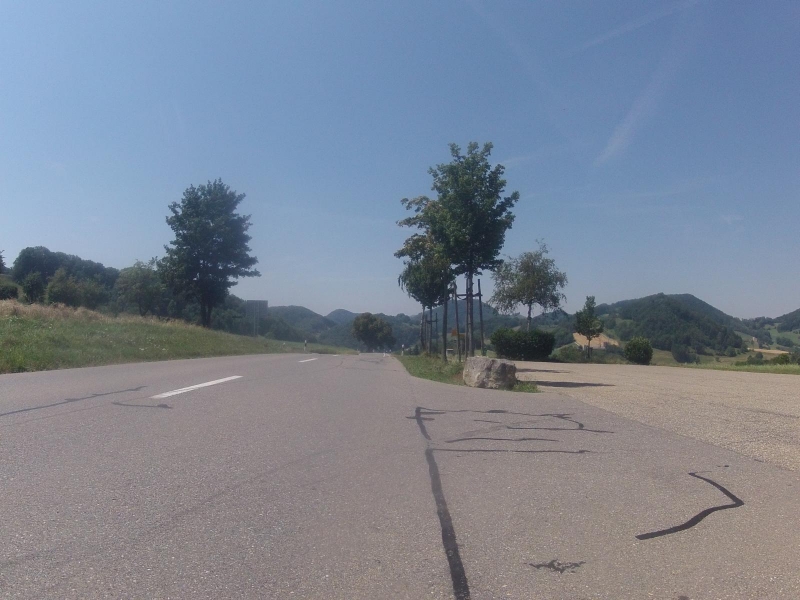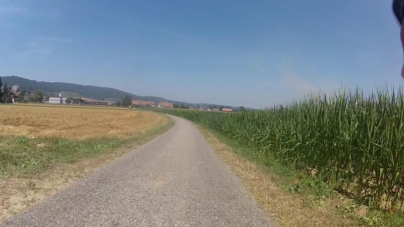 Die Baustelle in Aarau, hinter der Berufsschule, besteht immer noch. So richtig heiss ist es erst, wenn man auf der Strasse an der Sonne stehen bleiben muss. Der Fahrtwind fällt weg, kein Lüftchen, das Wasser im Bidon scheint zu verdunsten, wird rasch weniger.
