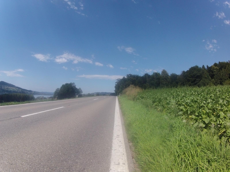 Es geht entlang von Baldeggersee, später folge ich dem Hallwilersee. Da gelingt der Kamera am Lenker sogar ein Schnappschuss von einem kleinen Stück See.