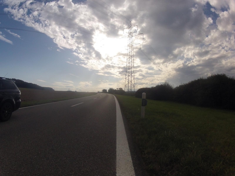 Statt direkt der Aare entlang nach Hause zu fahren, entschliesse ich mich, die Runde noch über den Zurzacherberg auszudehnen. Kurz bevor ich nach Koblenz um den Hügel herum fahre und damit sowieso wieder in den Schatten gelangen würde, wird die Sonne von der angekündigten Störung verdeckt. Noch sind die Wolken am Himmel weiss.