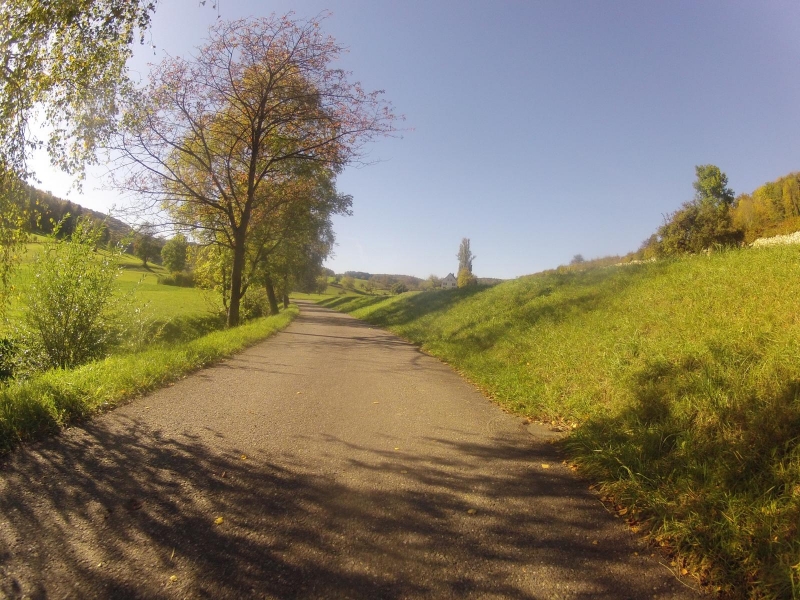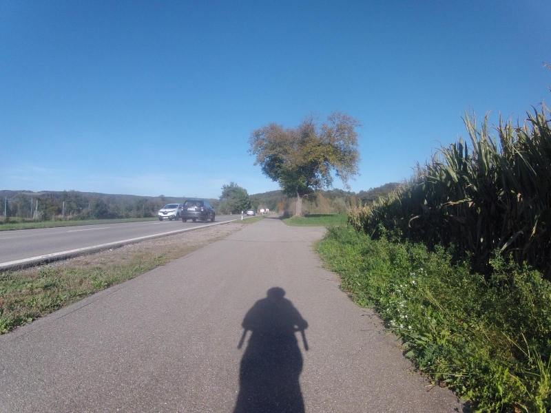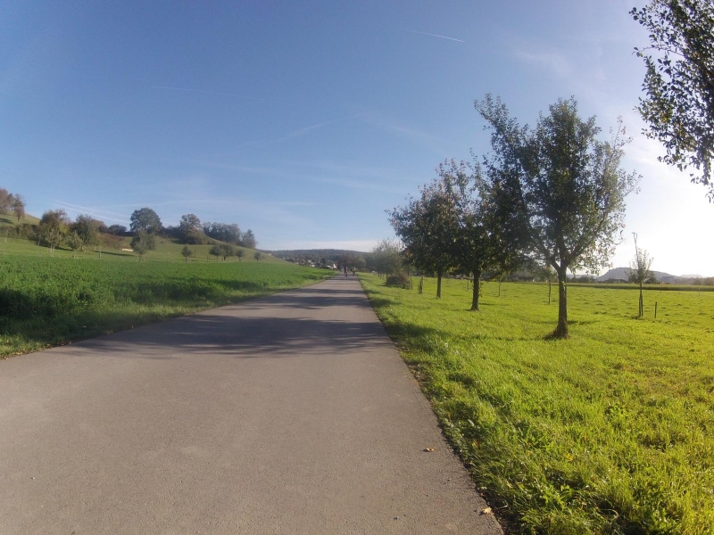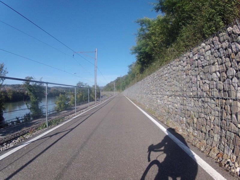 Zuerst auf einem Radweg hinauf bis nach Etzgen. Auf ziemlich engem Raum zwischen dem Rhein und den Berghängen des Jura, drängen sich hier die Hauptstrasse, die Bahnlinie und der Radweg hindurch.
