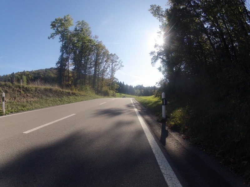 Die Abfahrt hinunter an den Rhein verläuft oft durch den Schatten von Wäldern und Hügeln. Oftmals ist die Strasse sogar von der nächtlichen Feuchtigkeit noch nass. Streckenweise bläst heute ein kräftiger Wind das Tal herauf.