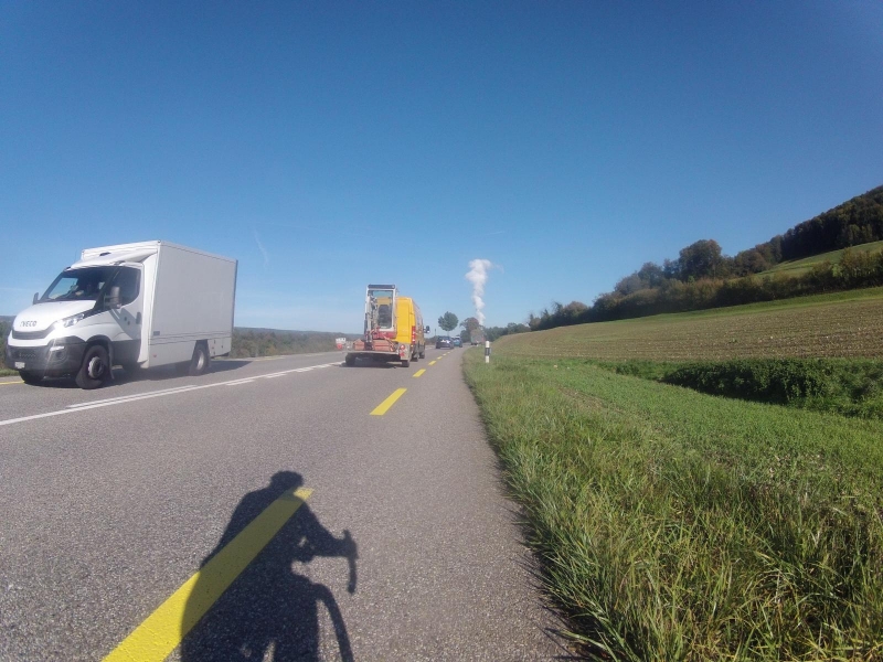 Heute hat es scheinbar viel Verkehr auf dieser Strasse. Doch der Eindruck täuscht. In meiner Fahrtrichtung führt ein Traktor mit einem Heuauflader die Kolonne an. Es gelingt mir, teils auch mit Hilfe des Rückenwindes, dieses Gefährt beinahe einzuholen. Nur wenige Meter haben gefehlt, da verlässt er die Strasse. Ich versuche den Schwung beizubehalten und komme weiterhin recht zügig vorwärts. Das ist denn auch die Erklärung für ein paar neue persönliche Bestleistungen bei Strava für diese Strecke.