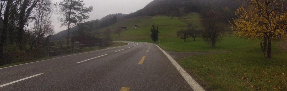 Als während dem Mittagessen doch plötzlich die Sonne die nasse Strasse zum Glänzen brachte, dauerte es nicht mehr lange bis ich auf der Strasse stand. Ich erwartete, dass sich der Regen dem Südfuss des Jura entlang nach Osten bewegt und sich irgendwo in unserer Gegend auflösen würde. Ich glaubte noch genügend Zeit zu haben, um über die Staffelegg ins Fricktal hinunter und später dem Rhein entlang aufwärts wieder nach Hause fahren zu können.
