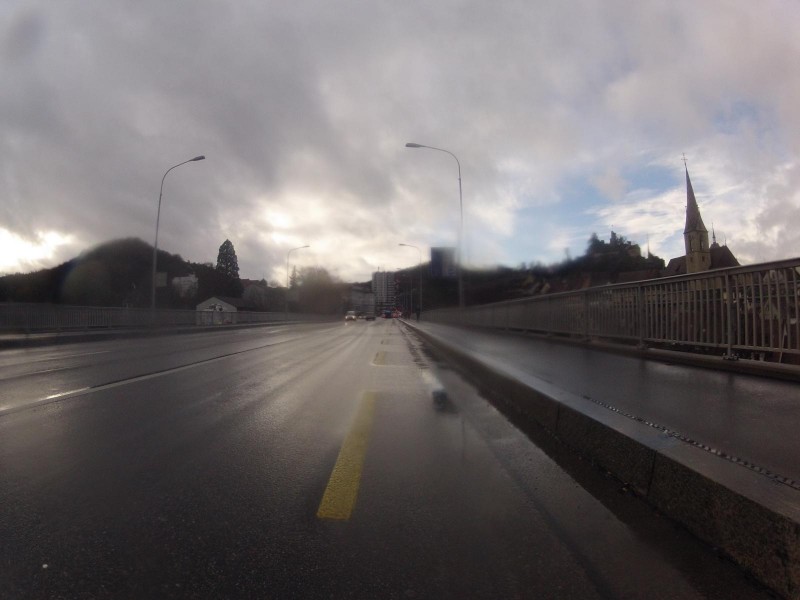 Ich rollte das Aaretal hinunter. Linkerhand, zwischen Bürensteig und dem Bruggerberg schob sich gerade eine Regenwand über das Villigerfeld. In meiner Fahrtrichtung hellte der Himmel mehr und mehr auf, sogar ein paar einzelne, weiss leuchtende Flecken an den Hängen des Schwarzwaldes konnte ich erkennen.