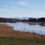 Im Vordergrund sitzen ein paar Enten im Gras und picken sich irgendwelche Leckereien aus der Wiese. Zwei Schwäne hatten das Bild schon verlassen, bis ich endlich mein Handy hervorgekramt hatte. Auch waren heute wieder viele Leute mit ihren Fernrohren auf dem Weg und suchten ganz angestrengt das Ufer ab.