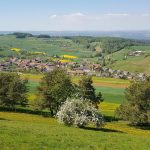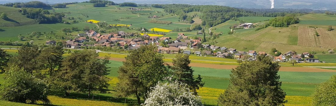 Hier mit der Sicht gegen Norden. Im Tal unten die Ortschaft Mandach, dahinter die letzte Reihe der Jurahügel, bei der Dampffahne des Kernkraftwerkes Leibstadt das Rheintal und dahinter bereits der südliche Schwarzwald.
