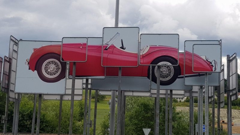 Da gibt es ja in der Gegend noch weitere Kreisel mit Dekorationen. Ich folgte zwar der Radroute 34 (alter Bernerweg) mehr oder weniger, aber nicht konsequent. So traf ich in der Nähe von Safenwil auch auf den Kreisel mit den Autoschildern. Wobei ich mir heute die Mühe machte, eine gute Position zu finden, dass das Auto auch wirklich gut ersichtlich wird. Obwohl es “nur” Schilder sind, die versetzt auf dem Kreisel stehen, ergibt sich ein eigenartiger 3D-Effekt.