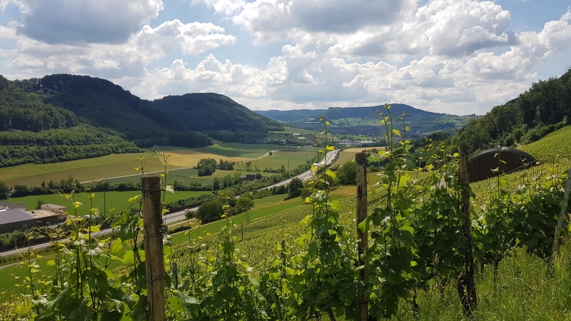 Immerhin sind vier Spitzkehren zu nehmen. Zwischen langsam gelb werdenden Getreidefeldern hindurch und an Rebbergen vorbei. Eine letzte langgezogene Kurve mit Blick nach Mandach hinunter ist noch zu nehmen und schon bin ich zu oberst angekommen.