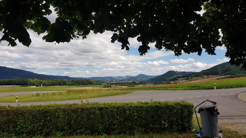 Während der Abfahrt hinunter bis in die Nähe des Rheins benutzte ich mal die Radwege, dann auch wieder die Hauptstrasse. Die Wolkenschicht lockerte sich langsam wieder auf. Dennoch blieb eine schwüle Wärme zurück. Zudem hatte ich in der Regel Gegenwind.