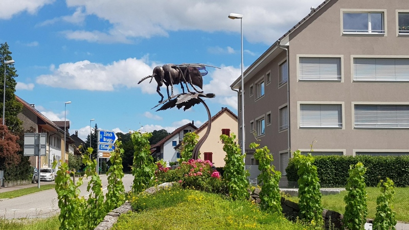 Dass der Name der Ortschaft (Hornussen) wohl die Idee für diesen Kreiselschmuck ist, dürfte offensichtlich sein.