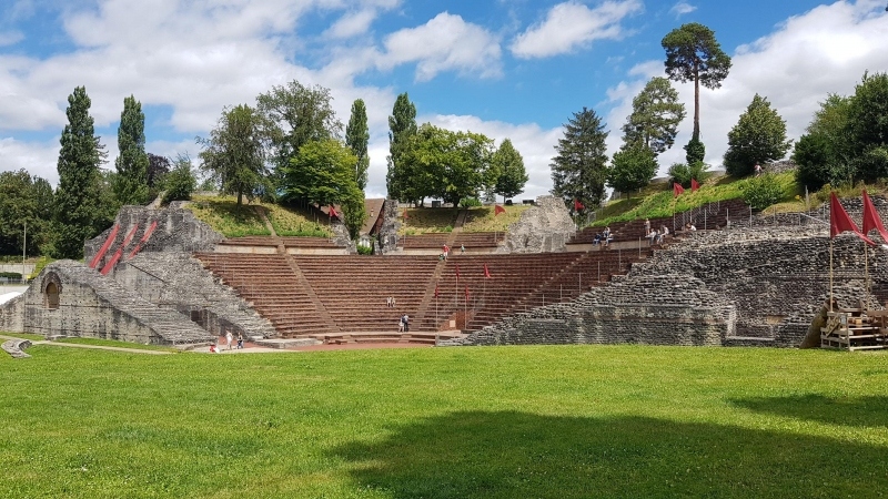 Mittagessen aus dem Rucksack auf dem Gelände von Augusta Raurica, dem römischen Amphitheater in Augst.