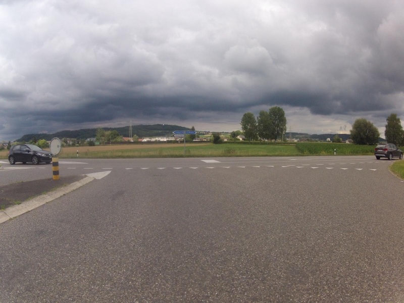 Etwas überraschend hängt da wieder einmal eine schwarze Wolke ziemlich genau über meinem weiteren Heimweg. Nach Mägenwil, wenn der Radweg ein paar Mal unter anderen grossen Strassen und der Autobahn hindurch geht, könnte ich ja einen Moment stehen, bleiben, falls sie wirklich ihre nasse Last abwerfen möchte.