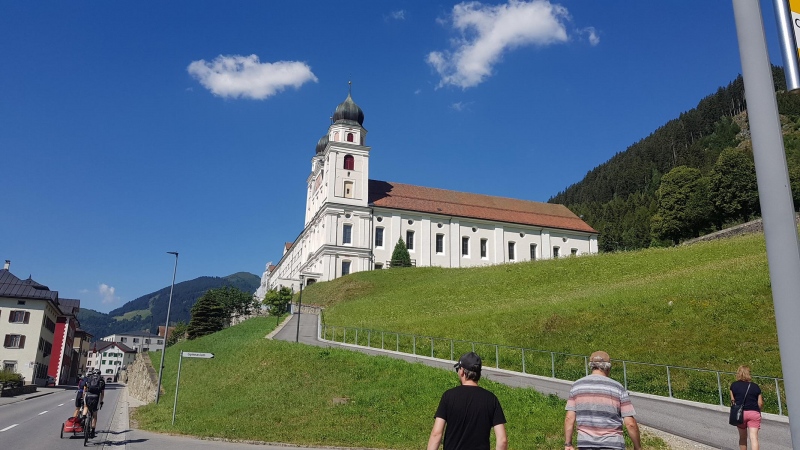 Eingangs Disentis hat meinen einen sehr schönen Blick auf das Kloster. Wichtiger für die meisten von uns war allerdings der Brunnen beim Parkplatz. Die Bidons wollten nochmals gefüllt werden, bevor es in die Höhe ging. Das Garmin zeigte schon wieder Temperaturen von um 30 Grad an.