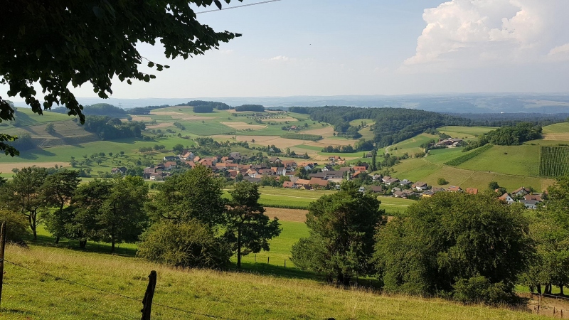 Auf der nördlichen Seite sieht man nach Mandach hinunter und im Hintergrund bereits die südlichsten Ausläufer des Schwarzwaldes.