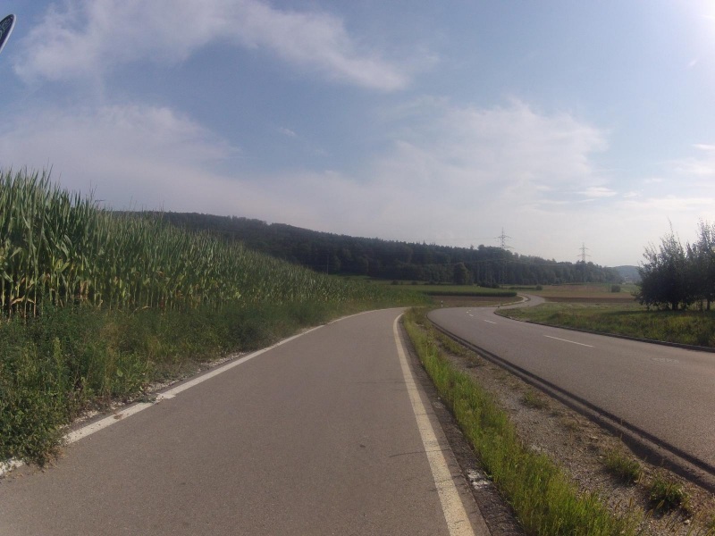 Bei der Aaremündung in den Rhein wende ich heute und fahre auf der anderen Seite der Aare bis Gippingen ein Stück zurück. Eine erste kurze Rampe, durch schattigen Wald, bringt mich nach Leuggern hinauf.