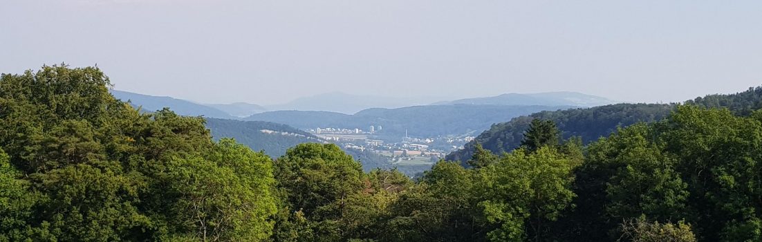 Auf der südlichen Seite geben die Wälder den Blick frei in Richtung Aaretal, Wasserschloss und dahinter das Limmattal. Wegen der dunstigen Wettersituation verliert sich der Blick schon bald, lange bevor man an die Alpen sieht.