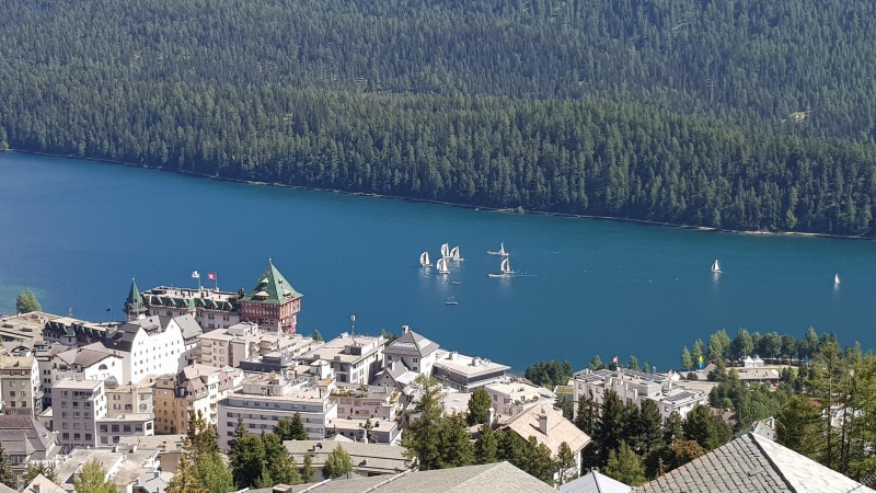 Offensichtlich drehte gerade eine Segelschule ein paar Runden mit ihren Segelschiffen. Begleitet von einem Motorboot und angeführt von einem der jedenfalls wusste, wie man ein Segelschiff im Malojawind zu führen hat.