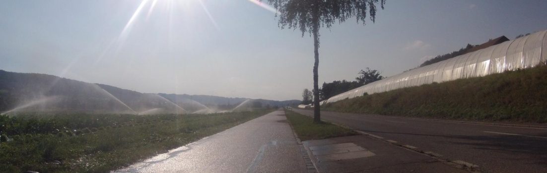 Im Furttal dann die Fahrt voll ins Gegenlicht. Immerhin lässt sich erkennen, dass die Gemüseplantagen bewässert werden müssen.