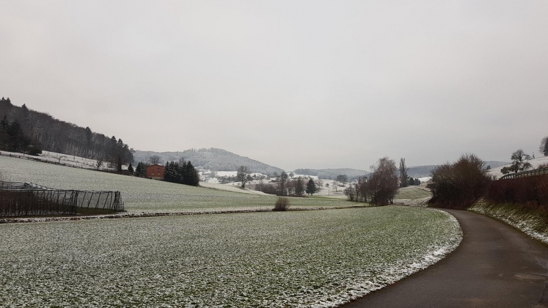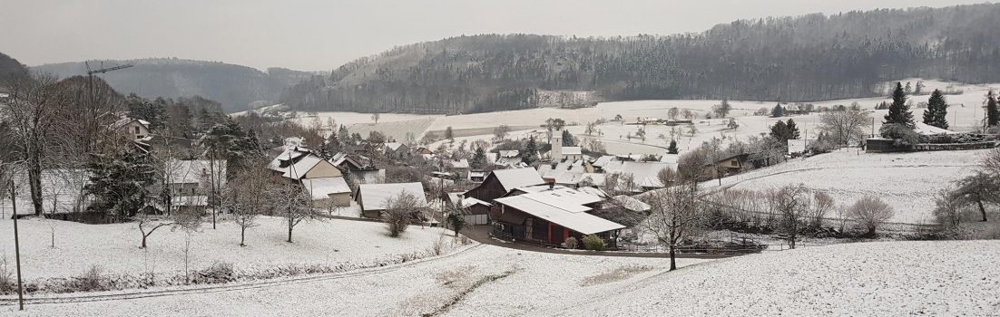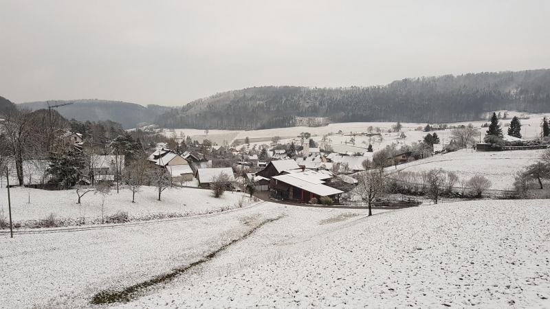 Erst recht, wenn der Weg nach Mönthal zur Bürensteig hinauf nochmals ein paar Meter ansteigt, dann sieht das Dorf Mönthal, von oben noch ein bisschen verschneiter aus.