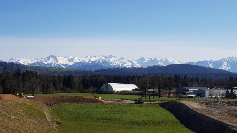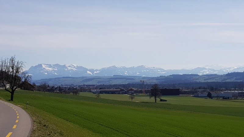 Danach geht es eine Weile lang zügig hinunter nach Emmen. Ich biege schon bald ab, komme am Militärflugplatz von Emmen vorbei und beginne mit dem Rückweg. Zuerst in Richtung Seetal, bis auf eine erste Anhöhe hinauf. Auch hier ist einer der Punkte, an denen ich oftmals bei längeren Fahrten vorbeikomme. Deshalb gibt es auch heute hier ein Foto vom Blick, hinüber zum Alpenkamm.