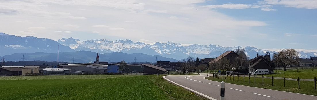 Ich fuhr den Rest des Bünztales hinauf. Auf dem vermuteten höchsten Punkt schoss ich auch heute das übliche Foto in die Alpen. Nur mit dem Unterschied, dass ich an dieser Stelle normalerweise auf dem Heimweg bin und so eigentlich den letzten Blick in die Alpen geniesse. Heute, hatte ich dieses Panorma spätestens seit Muri dauernd im Blickfeld vor mir.