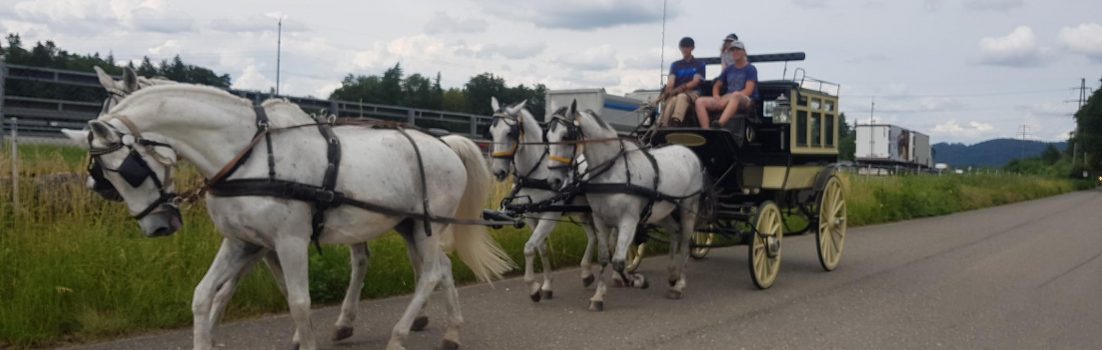 Einen solch schönen Vierspänner sieht man bei uns ja höchst selten. Entlang der Autobahn zogen die vier PS ihre Kutsche leicht trabend dahin.