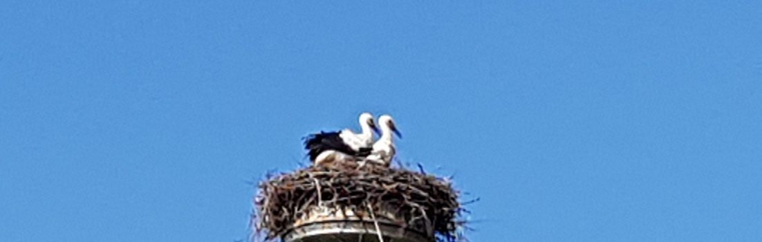 Hier werden dem Vernehmen nach drei Jungstörche aufgezogen. Ich nehme an, auf dem Foto dürfte einer der älteren, sowie zwei der Jungen zu sehen sein.