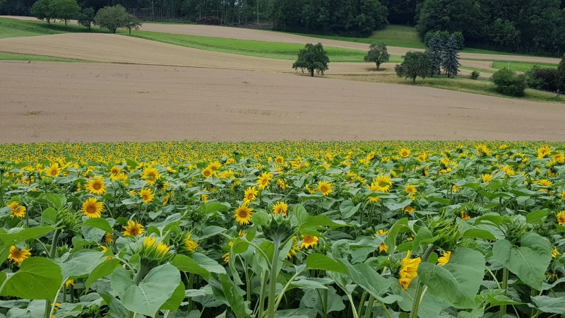 Der obige Regenschauer zog wohl ostwärts weiter. Ich konnte jedenfalls weiterhin auf trockenen Strassen weiter fahren, konnte mir sogar einen Umweg weit in den Hügel hinauf erlauben, um das blühende Feld von Sonnenblumen recht gut vor die Linse zu bekommen.