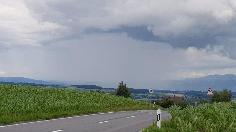 Nur wenige hundert Meter weiter, der Blick in meine Fahrtrichtung. Deutlich zu erkennen der Regenschauer ziemlich in der Mitte des Bildes. Immerhin schien es eher ein lokales Vorkommnis zu sein. Aber mich verliess der Mut, weiter zu fahren als nur gerade ins Seetal hinunter und dann weiter in Richtung nach Hause.