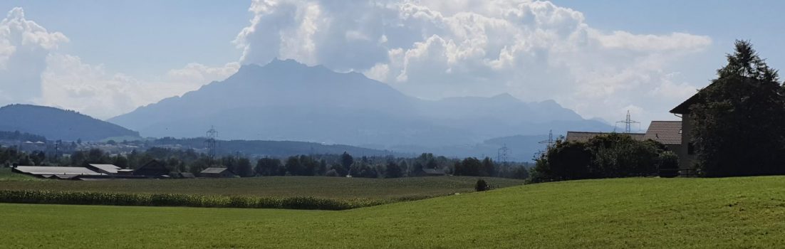 Bis ich endlich losfahren konnte, hatte ich auf dem GPS schon über 10 KM nur für Fahrten in den Quartieren und der Nachbargemeinde. Doch dann liess ich mich nicht mehr stören. Es ging über das Birrfeld, dann das Reusstal hinauf. Manchmal auf Radwegen, oft aber auch auf der Hauptstrasse. Die Fernsicht war nicht besonders gut. Lange sah man vom Alpenkamm kaum etwas. Als es langsam Zeit für das Mittagessen wurde, fand ich sogar ein schönes, hölzernes Bänkchen mit Sicht auf den Pilatus.
