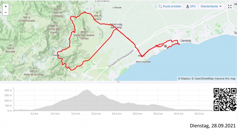 Nachdem ich ins Hotel zurückgekehrt war, setzte ich mich noch für eine kurze Runde aufs Rad. Da bietet sich die Prolog-Runde an. Zügig ging es über die Ebene an die Berge. Dort hatten sich in der Zwischenzeit ein paar dunkle Wolken versammelt.