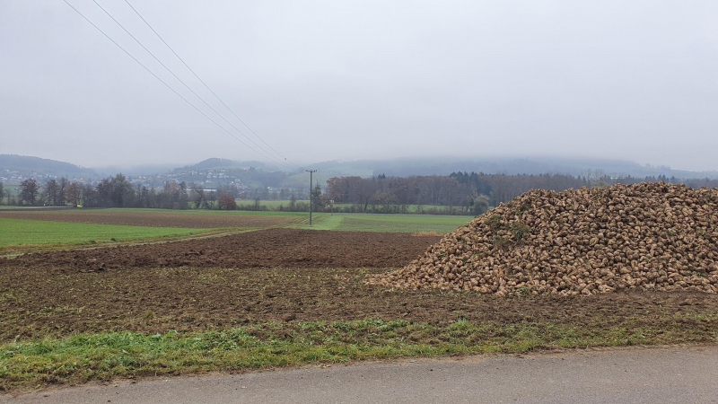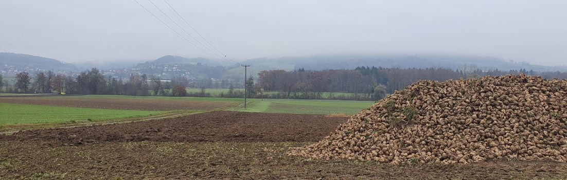 Das Foto hätte irgendwo entstehen können. Im Moment sieht es überall sehr ähnlich aus. Die Berge von Zückerruben, die umgepflügten Äcker, die leeren Wiesen, die entlaubten Bäume und eben über allem die Nebelschicht.