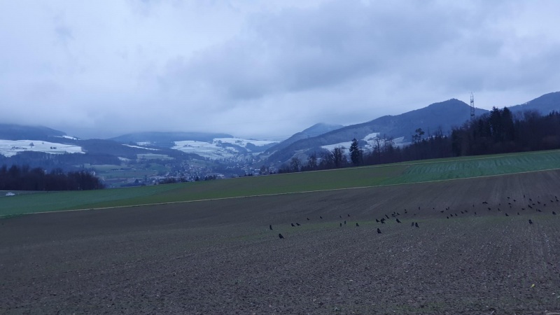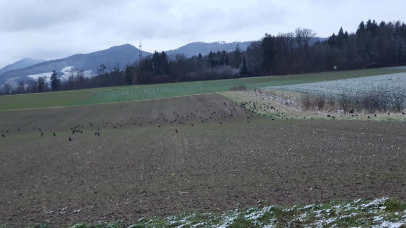 Ich glaube, ich habe noch selten so viele Krähen beieinander gesehen. Anfänglich befanden sie sich viel näher an der Strasse, aber als ich anhielt und an meiner Jacke herumfummelte entfernten sie sich immer weiter.
