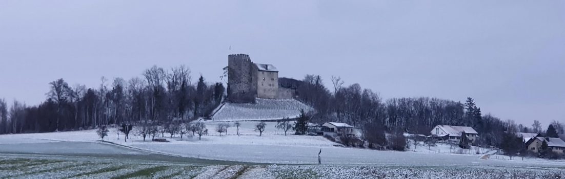 Um die heutige Aufgabe im Outdoorspiel Munzee zu erledigen hatte ich mir ein Munzee auf halbem Weg zur Habsburg hinauf ausgelesen. Es hatte gerade aufgehört zu schneien als ich das Rennrad auf die Strasse stellte. Eigentlich hätte der Himmel trocken bleiben sollen. Ich fuhr etwas unten herum und fuhr dann von Scherz in Richtung Habsburg hinauf. Als ich bei Scherz aus dem Windschatten der Habsburg kam, pfiff mir bereits ein eisig kalter Wind ins Gesicht.