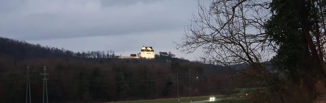 Nach Wildegg gibt es einen kleinen Anstieg nach Veltheim hinauf. Da hat man einen Moment lang einen recht schönen Ausblick hinüber zum Schloss Wildegg. Da die Dämmerung schon recht forgeschritten war, wunderte ich mich, dass mein Handy ein Foto noch in dieser Qualität hinbekommt.