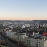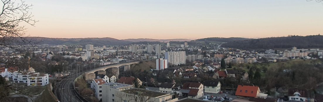 Für den Rückweg von Siggenthal Station fuhr ich zum Villigerfeld hinauf. Ziemlich genau in den Sonnenuntergang. Zu sehen war vor lauter Gegenlicht kaum etwas. Doch kurz bevor es in die Tiefe ins Aaretal hinunter geht, gibt es einen schönen Aussichtspunkt: