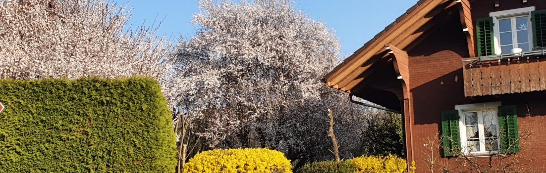 Dabei kam ich an diversen schneeweissblühenden Sträuchern vorbei. Auch die Forsythie steht mittlerweile in voller Blüte in vielen Gärten.