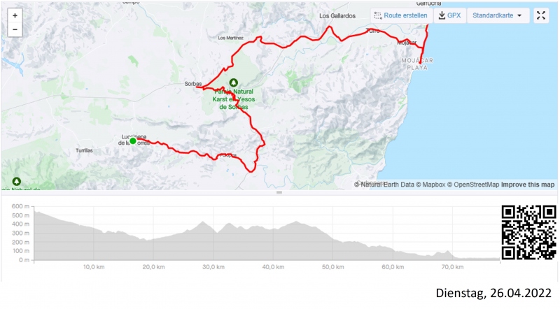 Mittagessen dann wie üblich bei dieser Runde in Sorbas, bevor wir den zweiten Teil der Fahrt in Angriff nehmen. Ausser ein paar Gegensteigungen und einem etwas längeren Hügel, geht es nun abwärts, wieder zurück an das Meer.