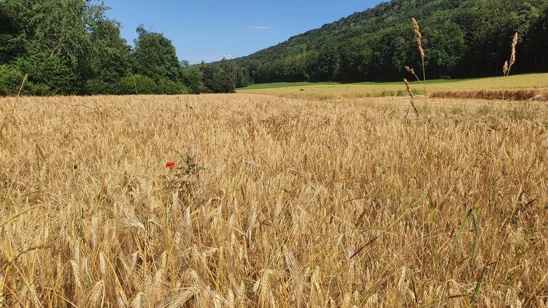 Ich mag sie, die goldgelben Getreidefelder. Kaum ein Unkraut wächst darin, fast klinisch sauber. Und doch schafft es ab und zu eine Mohnblume oder Kornblume, das fast ungetrübte Gelb zu stören. Das Feld nebenan wird gerade gemäht. Andere Getreidesorten sind noch recht grün, da wird der Mähdräscher wohl noch etwas warten müssen.