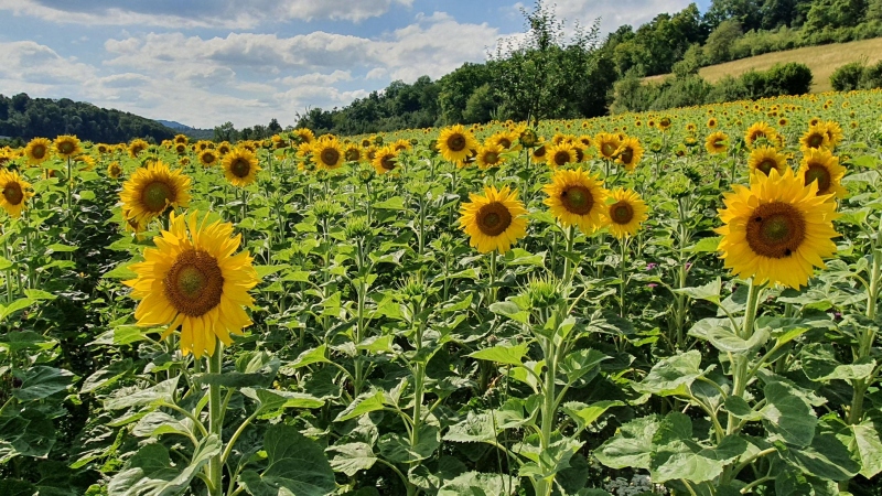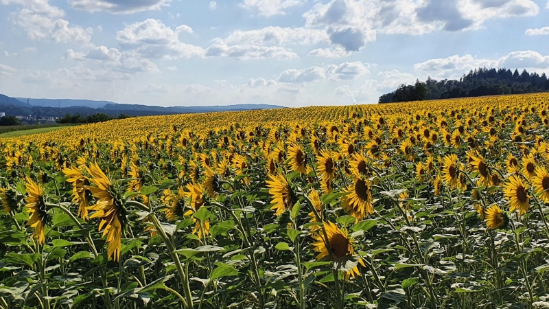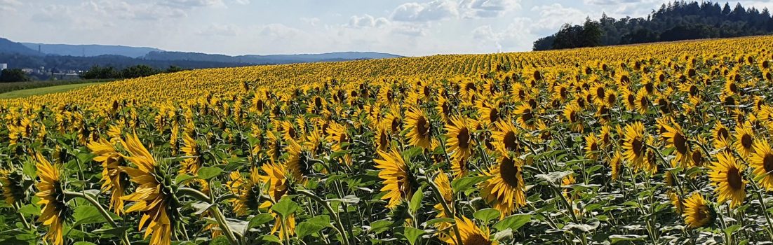 Nach dem Birrfeld fuhr ich das Bünztal hinunter, überquerte die Aare bei Wildegg und fuhr an den Waldrand oberhalb Auenstein. Auch dort stand nochmals ein Sonnenblumenfeld, bei welchem aber wesentlich mehr Sonnenblumen geöffnet waren.